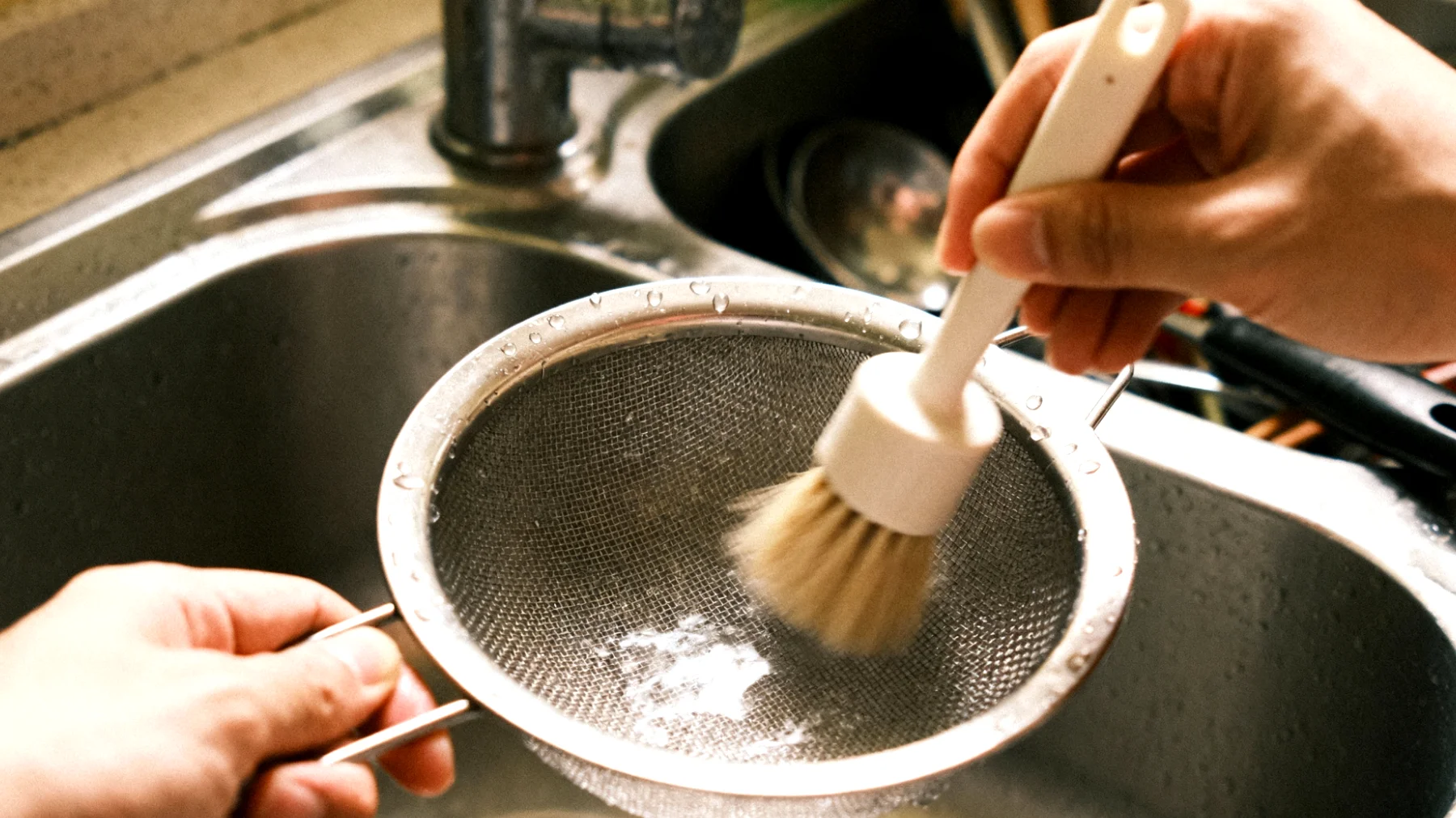 Lascia in ammollo per circa 30 minuti. Questo tempo permette agli agenti pulenti di penetrare a fondo nelle maglie e di agire sui residui più resistenti. Trascorso il tempo di ammollo, rimuovi il colino e sfrega delicatamente le maglie con una spazzolina a setole morbide. Mai utilizzare spugnette abrasive: queste potrebbero graffiare la superficie metallica, creando microfessure che favorirebbero futura ossidazione.