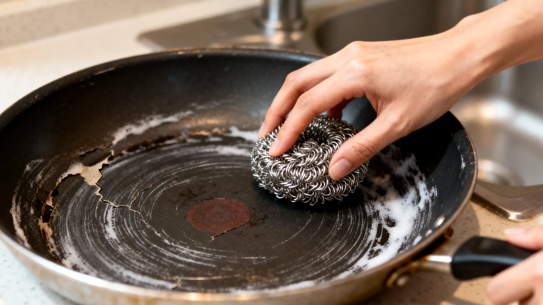 Il quarto elemento dannoso sono gli shock termici improvvisi. Passare da una fiamma viva a un’immersione in acqua fredda sottopone la struttura interna della padella a stress enormi. L’alluminio si espande e si contrae rapidamente, e il rivestimento antiaderente, che ha un coefficiente di dilatazione termica diverso dal metallo sottostante, subisce tensioni che nel tempo portano a microfratture e distacchi.